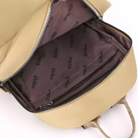 Espacio: Mantén todo organizado con sus múltiples compartimentos. Incluye un bolsillo principal amplio con cierre seguro, un bolsillo mediano adicional y un pequeño frontal con cierre. El interior está forrado con un acabado textil de diseño elegante.